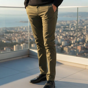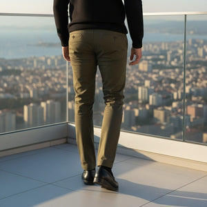 Add a rugged yet refined element to your rotation with our Men's Smart Fit Cotton Chinos in rich Olive Green. This deep, muted shade is perfect for introducing texture and depth to your outfit, moving easily between casual wear and smart-casual settings. Crafted from breathable cotton, these chinos offer the perfect blend of tailored structure and lasting comfort.