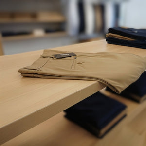 These camel smart fit cotton trousers are the ideal partner for a navy blue blazer and white shirt, or paired casually with your Charcoal Grey Scuba Pullover for a contemporary, color-blocked aesthetic.